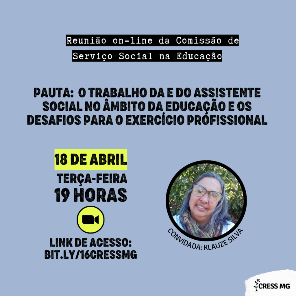 Nesta terça (18/4), às 19h, tem reunião on-line da Comissão de Serviço Social na Educação.