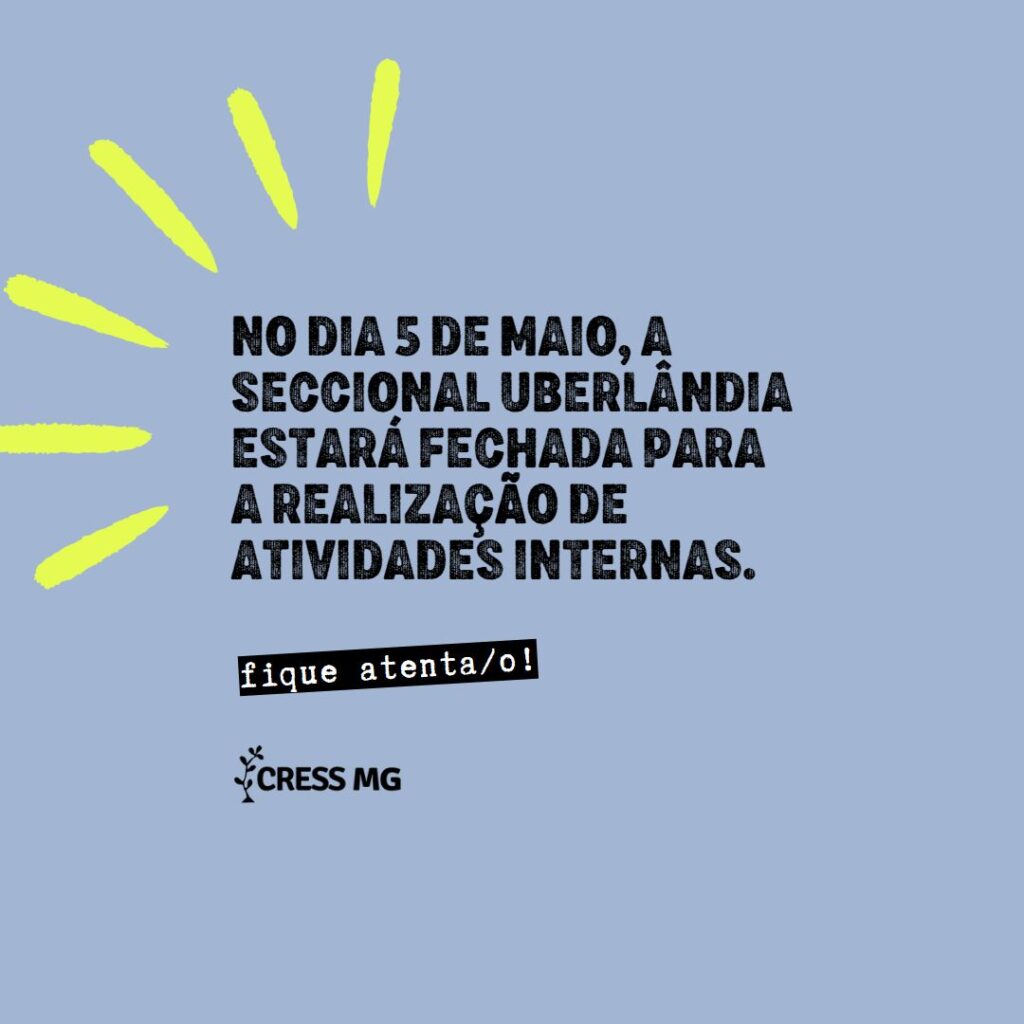 Em virtude de atividades internas, a Seccional Uberlândia do CRESS-MG terá o funcionamento alterado nesta sexta-feira, dia 5 de maio.