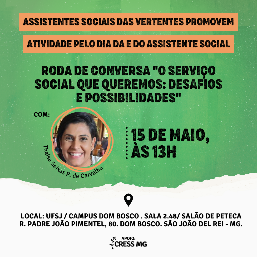 Com a proposta de uma tarde leve, com muito conteúdo e mobilização da categoria, as e os assistentes sociais das Vertentes realizam nesta segunda-feira, 15/05, uma roda de conversa com o tema “O serviço social que queremos: desafios e possibilidades”.