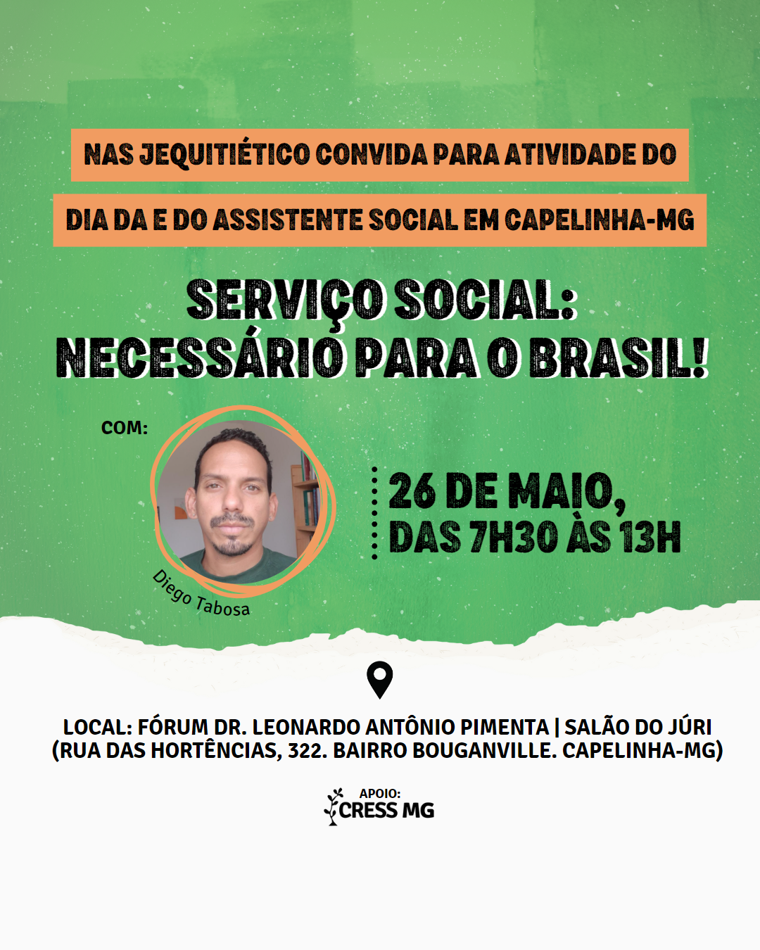 O evento, que será sediado no salão do júri do Fórum Dr. Leonardo Antônio Pimenta, contará com a participação do assistente social e professor da Universidade Estadual de Montes Claros (Unimontes), Diego Tabosa.