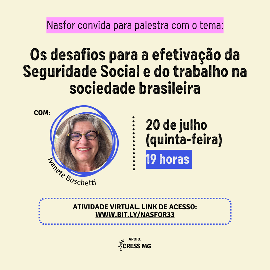 O Núcleo de Assistentes Sociais de Formiga e Região (Nasfor) promove palestra virtual com o tema “Os desafios para a efetivação da Seguridade Social e do trabalho na sociedade brasileira”.