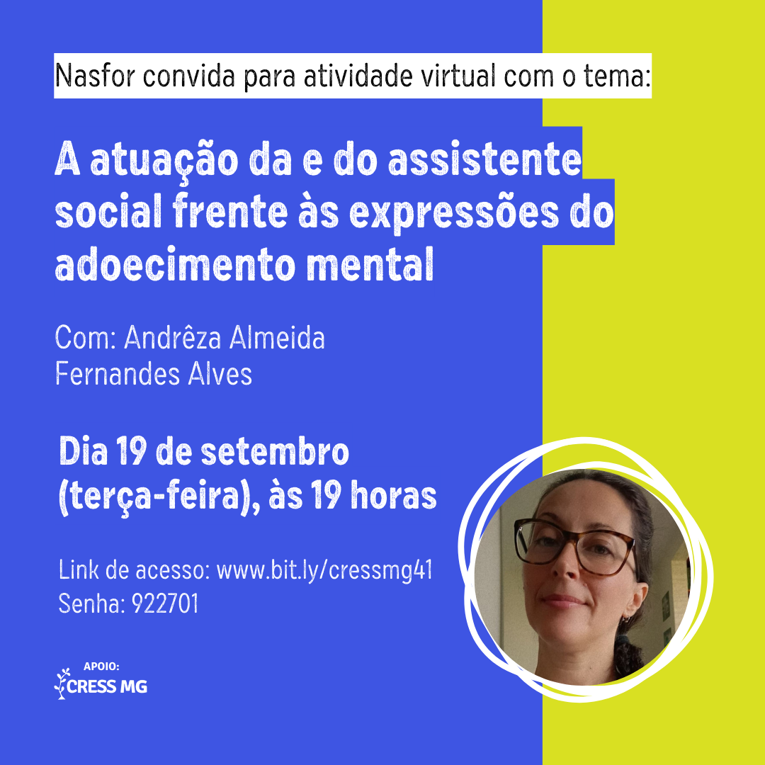 Atuação da e do Assistente Social Frente às Expressões do Adoecimento Mental é o tema escolhido para a próxima atividade do NAS Formiga e Região (Nasfor), promovida virtualmente, no dia 19 de setembro.