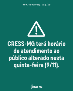 CRESS-MG terá horário de atendimento ao público alterado nesta quinta-feira (9/11)