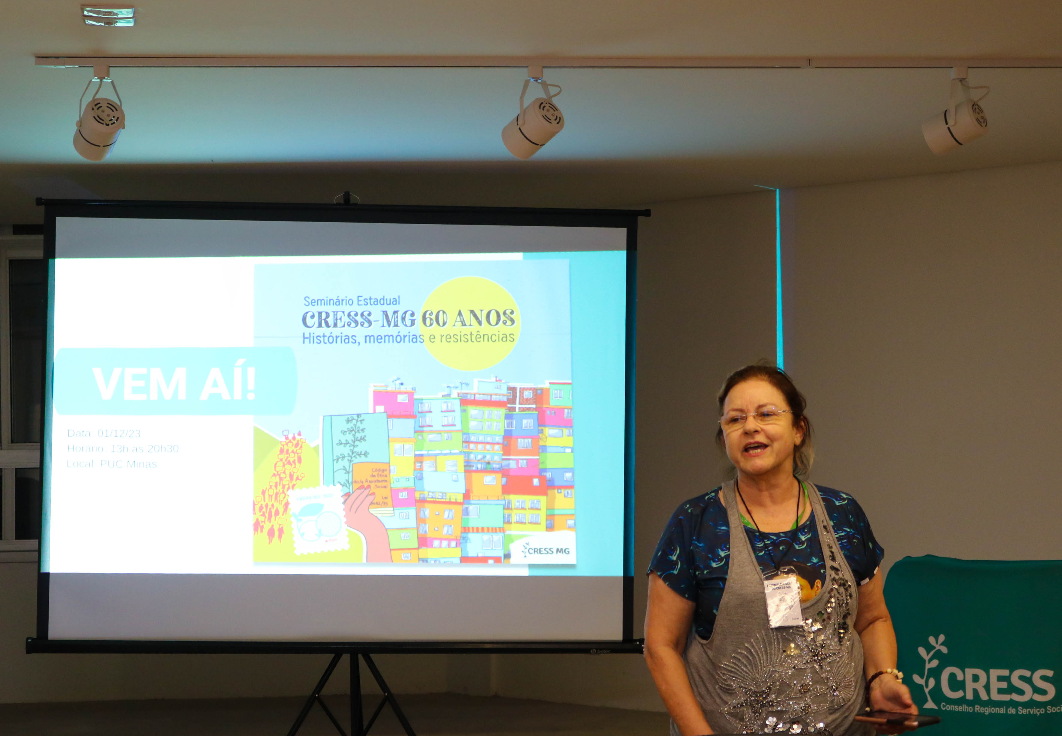 Vice-presidenta do CRESS-MG, Glaucia Batista, comentando sobre as ações realizadas no último ano.