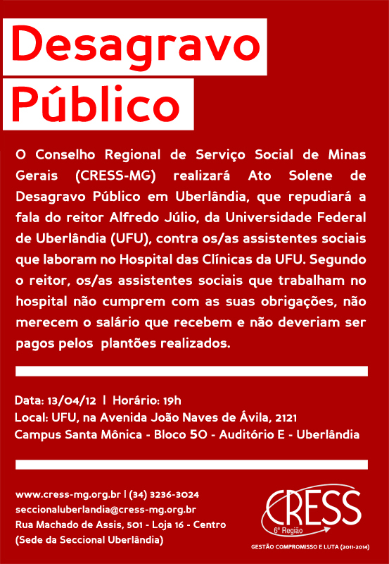 O Ato Solene de Desagravo Público que será realizado conta com a assessoria jurídica do Conselho, é coordenado pela Comissão Permanente de Ética e objetiva atender profissionais que vivenciaram e denunciaram ações consideradas inadimissíveis. O Ato pretende defender a categoria profissional, fomentando o Código de Ética do Serviço Social.