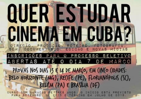 A Coordenação dos Exames de seleção para a Escola Internacional de Cinema de TV de Cuba no Brasil (EICTV) comunica que estão abertas, até o dia 7 de março, as inscrições para o Processo Seletivo 2015 / 2018. As provas serão aplicadas nos dias 13 e 14 de março, em cinco cidades: Belo Horizonte (MG), Recife (PE), Florianópolis (SC), Belém (PA) e Brasília (DF).