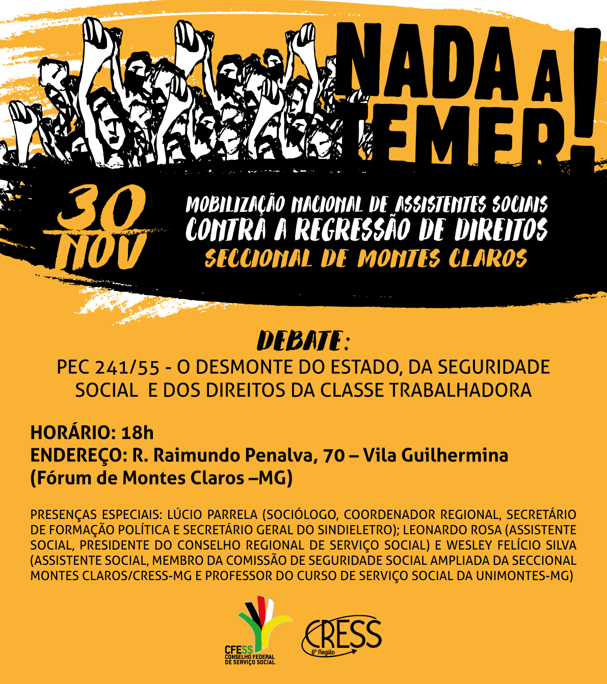 Os Núcleos de Assistentes Sociais (NAS) da abrangência da Seccional Montes Claros/CRESS-MG realizarão Rodas de Conversa sobre a PEC 241/55. Em todos os debates serão exibidos vídeos, que darão embasamento às discussões.