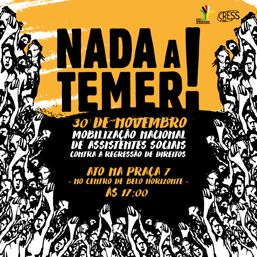 Nada a Temer: assistentes sociais contra a regressão de direitos! É com este lema que o CRESS-MG convoca a categoria para os atos que vão acontecer em Minas Gerais, no dia 30 de novembro, como resposta ao desmonte do Estado brasileiro, expresso nas medidas adotadas pelo governo ilegítimo de Michel Temer, que atacam e destroem direitos da classe trabalhadora.