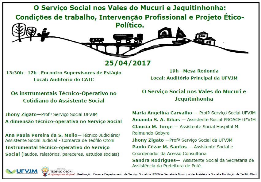 Dia 15 de maio é dia da e do Assistente Social. Esse não é só um dia comemorações, é um dia de luta! Por isso, o Curso e o Departamento de Serviço Social da UFVJM planejaram uma atividade que acontecerá no dia 25 de abril, que tem como finalidade debater sobre a intervenção profissional das e dos assistentes sociais na região, estabelecendo como mediações principais as condições de trabalho da/o assistente social frente às atuais transformações societárias e o Projeto Ético-Político da profissão.