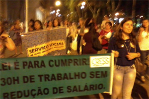 Segundo Raquel, a manifestação vem reafirmar que a batalha para garantir o direito à redução da jornada de trabalho continua. A Lei nº 12.317/2010, que estipula a carga horária de 30 horas semanais para os assistentes sociais, ainda não é plenamente respeitada. “Conquistar a lei foi de extrema importância como primeiro passo, mas as 30 horas só serão garantidas mesmo através da luta, que constitui o segundo passo para o qual toda a categoria deve ser continuamente mobilizada. O balanço é ruim, pois parte dos assistentes sociais continua sem gozar do direito adquirido”, avalia Raquel.