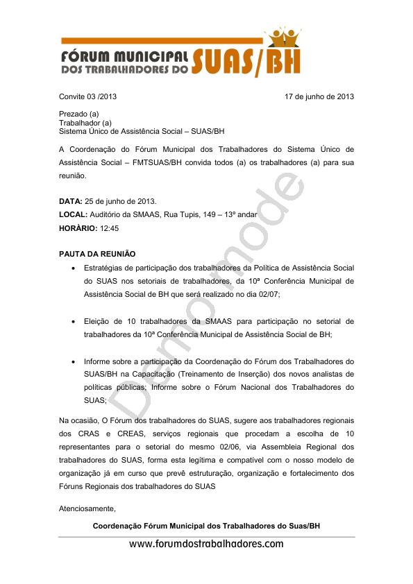 Fórum Municipal dos Trabalhadores do Suas BH convida para reunião