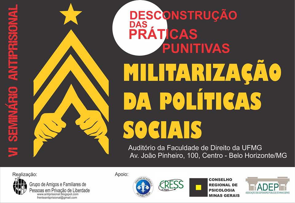 O Grupo de Amigos e Familiares de Pessoas em Privação de Liberdade realiza nos dia 23 e 24 de agosto, no auditório da Faculdade de Direito da UFMG, o 6º Seminário Antiprisional, que terá como discussão central a “Desconstrução das Práticas Punitivas”. O evento tem o apoio de entidades como o CRESS-MG e o Conselho Regional de Psicologia (CRP-MG).