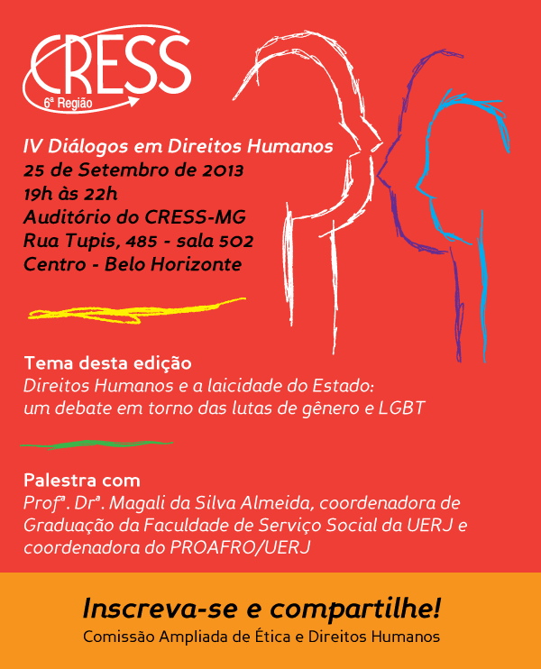 Nesta quarta-feira, 25 de setembro, o CRESS-MG promove, na Sede (BH), a quarta edição do Diálogos em Direitos Humanos, que abordará a relação do Estado Laico com as lutas dos movimentos LGBT e de gênero.