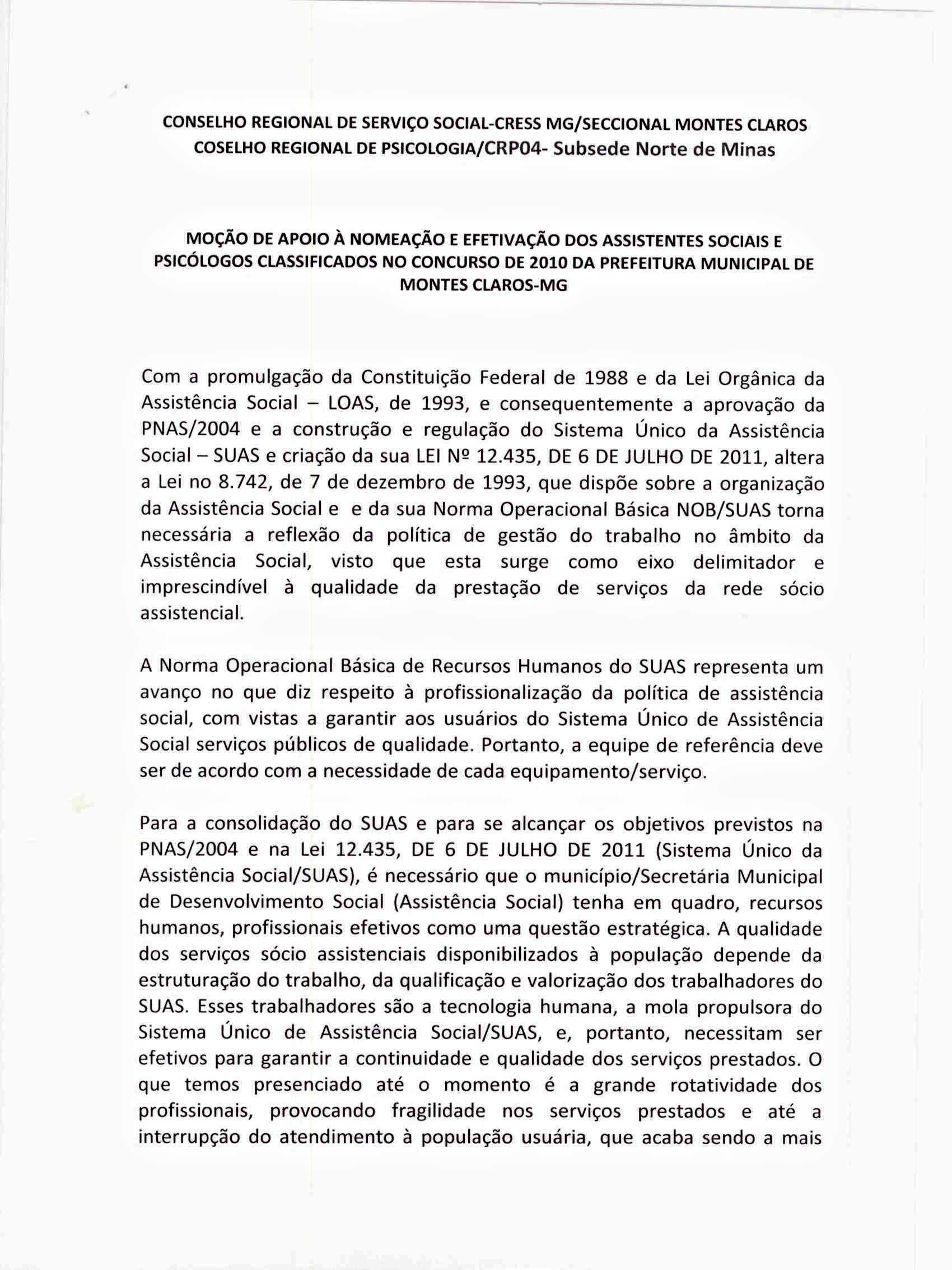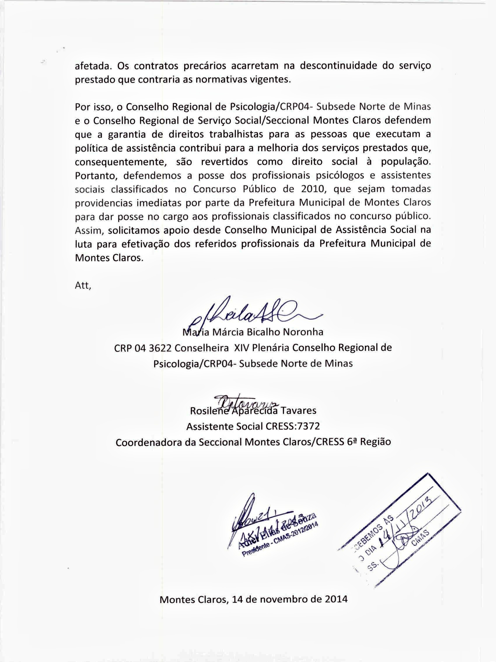 No dia 14, a diretora da Seccional, Carla Pereira e a conselheira do CRP-MG, Márcia Bicalho, participaram de uma reunião do Conselho Municipal de Assistência Social, na qual foi assinada pelo presidente do CMAS, a Moção de Apoio à nomeação e efetivação dos assistentes sociais e psicólogos classificados no concurso de 2010 da Prefeitura Municipal de Montes Claros.