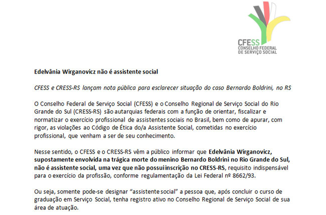 Nesse sentido, o CFESS e o CRESS-RS vêm a público informar que Edelvânia Wirganovicz, envolvida na trágica morte do menino Bernardo Boldrini, no Rio Grande do Sul, não é assistente social, uma vez que não possui inscrição ativa no CRESS-RS, requisito indispensável para o exercício da profissão, conforme regulamentação da Lei Federal nº 8662/93.