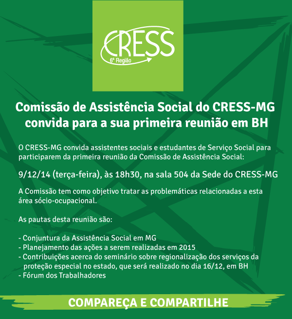 Confira outras reuniões de grupos de trabalho e comissões do CRESS-MG: https://www.cress-mg.org.br/calendario