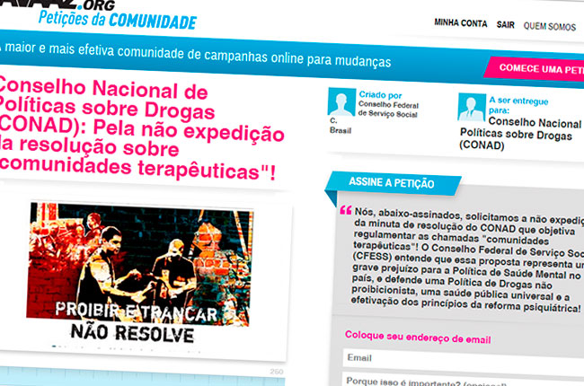 Encontra-se em discussão, no âmbito do Conselho Nacional de Políticas sobre Drogas (Conad), a regulamentação das entidades denominadas “comunidades terapêuticas”. O processo, que está em consulta pública até 28 de fevereiro, visa a regulamentar a existência de entidades de internação de longa permanência, com financiamento do Fundo Nacional de Drogas. O CFESS já se manifestou contrário à expedição dessa resolução e lança hoje um abaixo-assinado contra a aprovação do documento pelo Conad, por entender que essa proposta representa um grave prejuízo para a Política de Saúde Mental no país. (clique aqui para assinar)