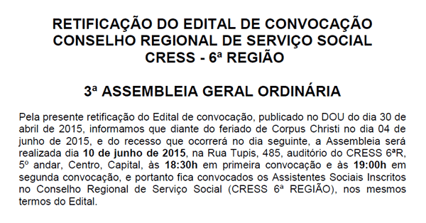 Convocação para Assembleia Geral na Sede (BH) dia 10/06