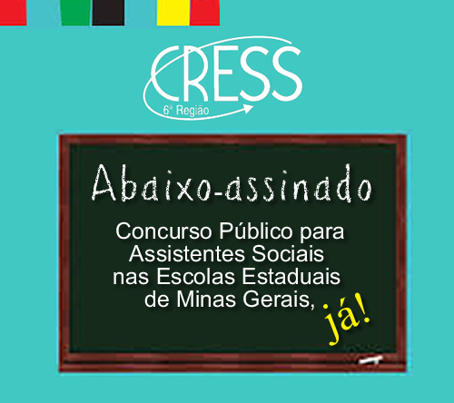 Considerando o histórico dos últimos anos, em que a Secretaria de Estado de Educação de Minas Gerais (SEE) oferta somente cadastro de designação para assistentes sociais, o Conselho Regional de Serviço Social de Minas Gerais – CRESS 6ª Região, requer, por meio deste abaixo-assinado, que o Governo do Estado de Minas Gerais realize concurso público para assistentes sociais, garantindo, no mínimo, 1 (uma) vaga para cada uma das 3.672 Escolas Estaduais de Minas Gerais.