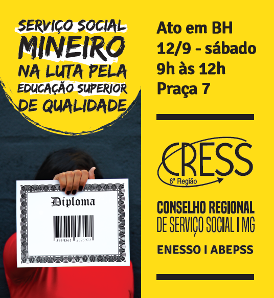 O CRESS-MG, em parceria com a Enesso e a Abepss, promove amanhã, dia 12, em Belo Horizonte, um ato político pela educação superior de qualidade. A concentração será das 9h às 12h, na Praça Sete. O objetivo é reunir representantes da categoria, estudantes e a população em geral para uma mobilização a favor da educação, principalmente a educação superior, que passa por um processo de empresariamento no Brasil, reforçado pelo aumento das parcerias público-privadas.