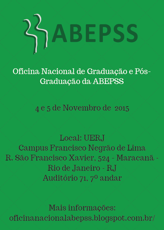 A Oficina Nacional da ABEPSS, que ocorre a cada dois anos, já tem data marcada em 2015: o encontro acontece nos dias 4 e 5 de novembro, nas dependências da Faculdade de Serviço Social da UERJ, no Rio de Janeiro. Além da programação oficial, acontecerá o Fórum de Coordenadores de Pós-Graduação em Serviço Social, atividade complementar que será realizada na escola de Serviço Social da UFRJ, no dia 3 de novembro.