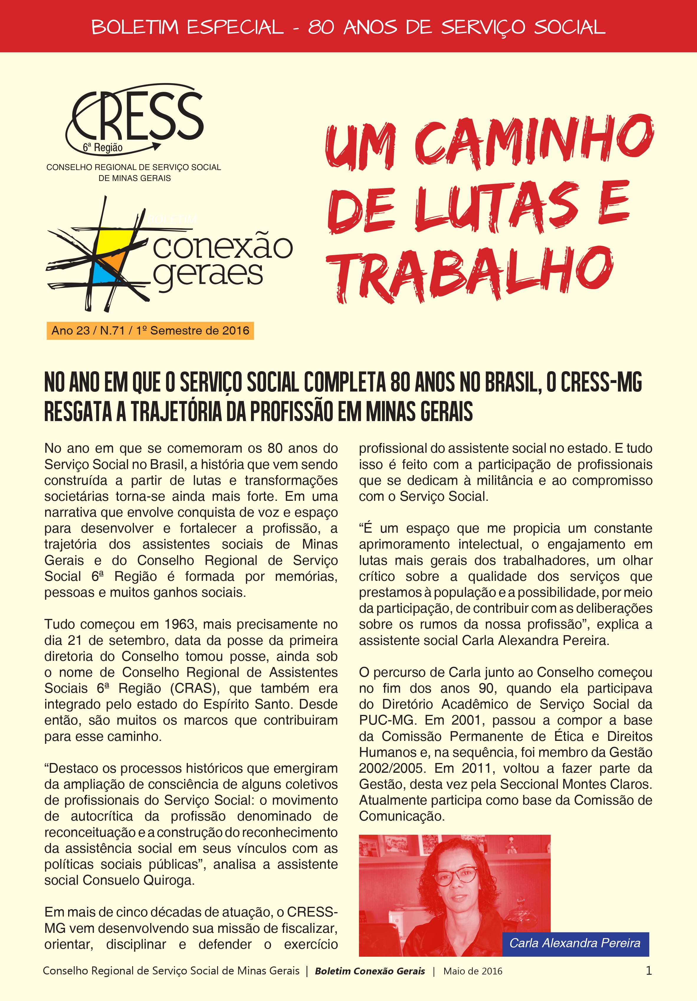 A trajetória, o trabalho, os personagens e as lutas que compõem a história do Serviço Social em Minas Gerais, nesta edição especial do Boletim Conexão Geraes do 1º semestre de 2016, lançado em maio.