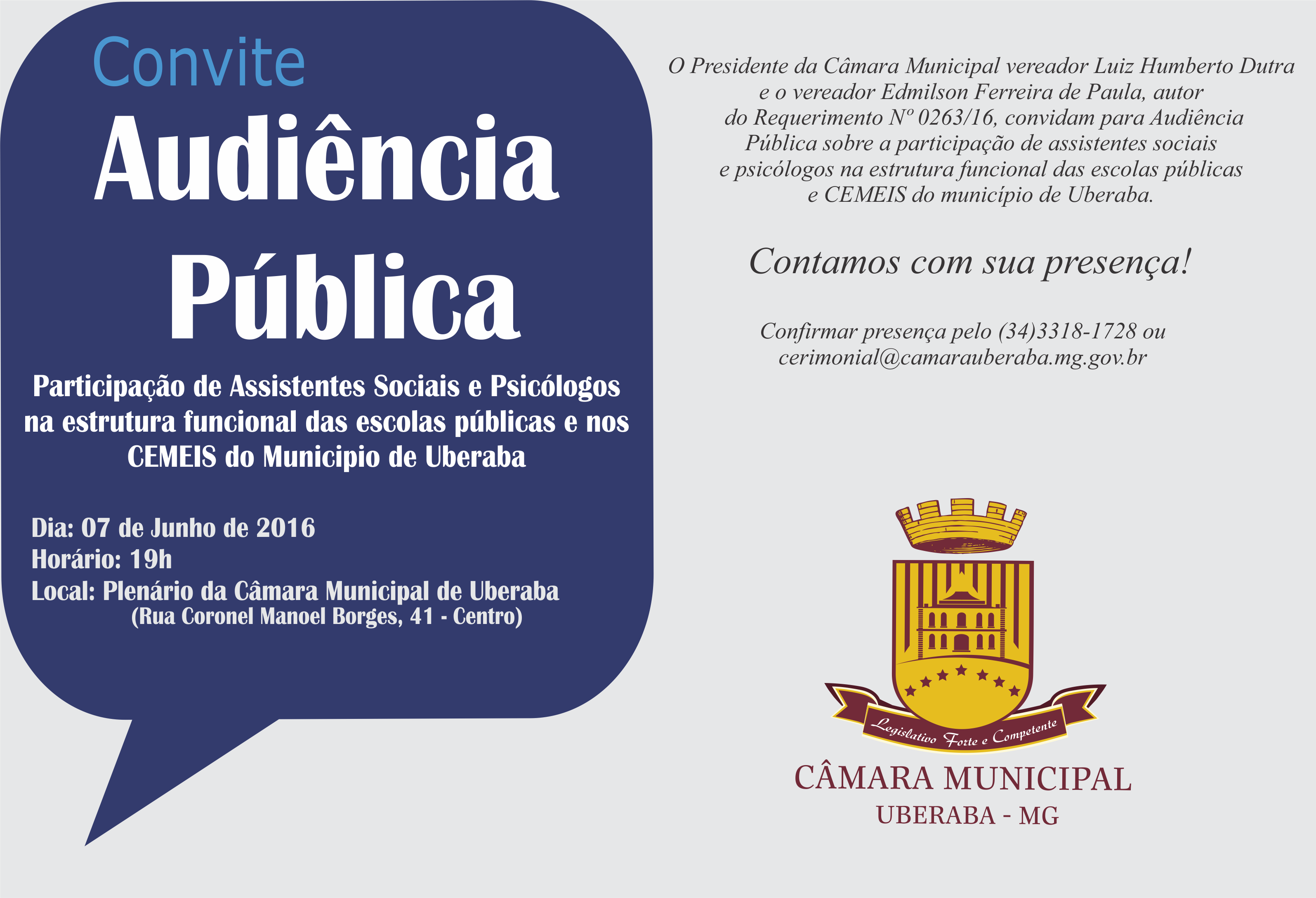 O CRESS-MG – Seccional Uberlândia convoca os/as Assistentes Sociais de sua área de jurisdição a comparecer ao plenário da Câmara de Vereadores de Uberaba para discussão sobre a inserção de Assistentes Sociais e Psicólogos na rede pública municipal de educação de Uberaba.