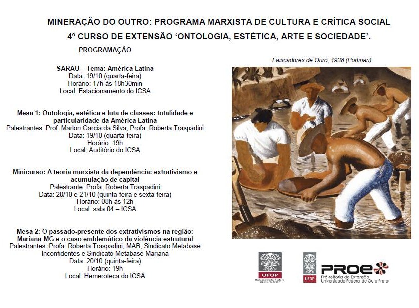 A Universidade Federal de Ouro Preto promove, de 19 a 21 de outubro, a 4ª edição do Curso de Extensão “Ontologia, Estética, Arte e Sociedade”, vinculado ao Programa de Extensão Mineração do OuTro: Programa Marxista de Cultura e Crítica Social.