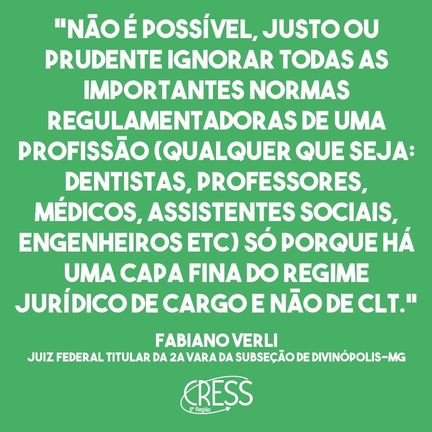 Ao reavaliar o caso, o juiz concordou com o CRESS-MG, autor do processo, em que, de fato, nada há no direito brasileiro que automaticamente, sem previsão expressa, restrinja pontos de regulamentações de profissões específicas aos celetistas, deixando desprotegidos quem estiver ligado a regime jurídico das/os servidoras/es deste ou daquele ente estatal. O juiz ainda pontuou que: