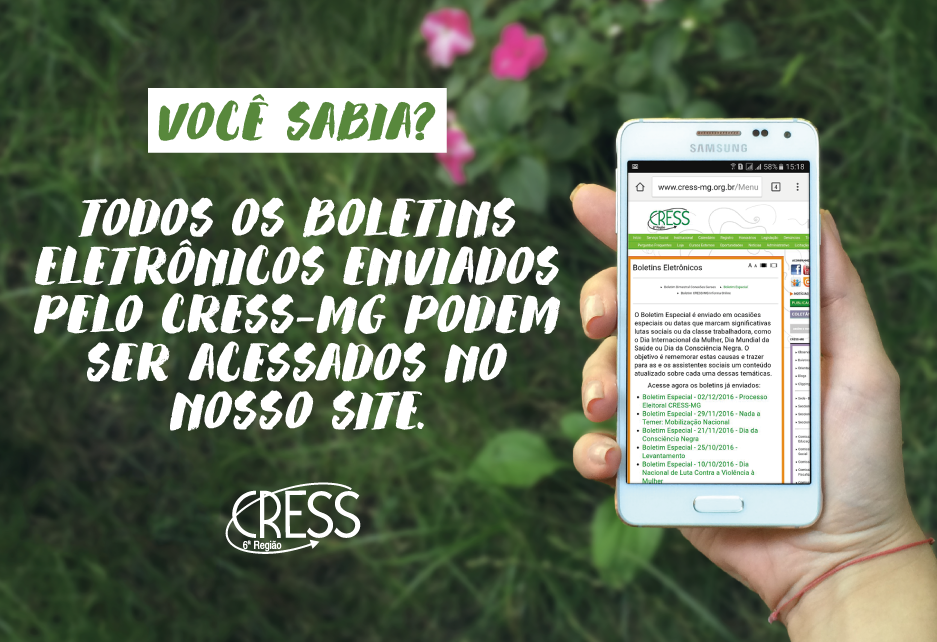 • Com teor informativo, este boletim tem a periodicidade quinzenal e traz um compilado das últimas ações feitas pelo CRESS-MG. O material é ideal para quem não consegue acompanhar diariamente o site e o Facebook da instituição, mas quer se inteirar das atividades em que o Conselho tem se envolvido, seja na realização ou como apoiador.