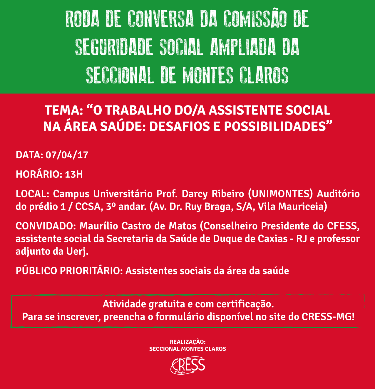A Comissão de Seguridade Social Ampliada da Seccional de Montes Claros convida as/os assistentes sociais da área da saúde para participarem da Roda de Conversa: “O trabalho do/a assistente social na área Saúde: desafios e possibilidades”.