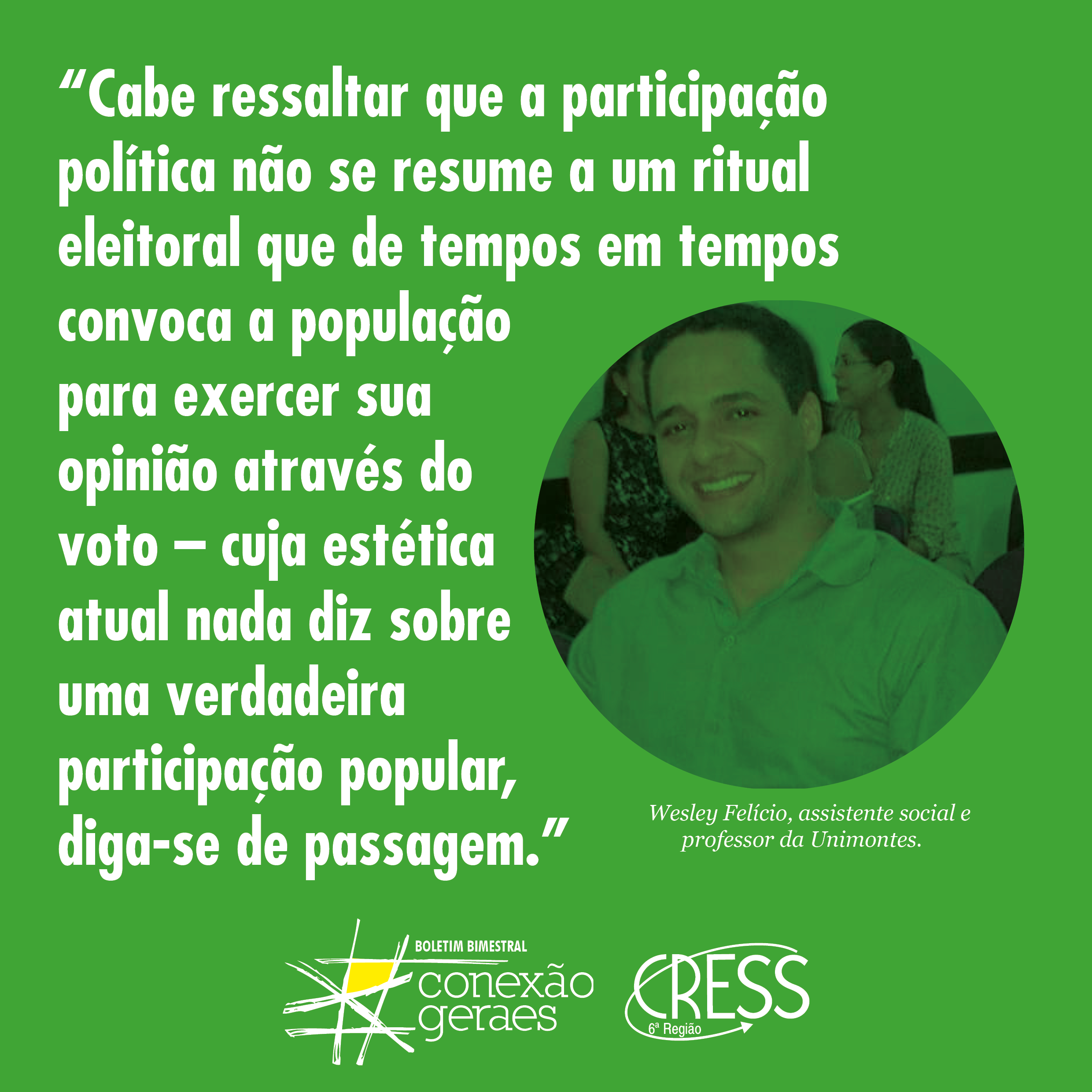 Na tentativa de esmiuçar cada um dos 11 princípios fundamentais do Código de Ética, neste número do Boletim Conexão Geraes, o CRESS-MG entrevistou o assistente social e professor da Unimontes, Wesley Felício, sobre o quarto princípio, que prevê a “Defesa do aprofundamento da democracia, enquanto socialização da participação política e da riqueza socialmente produzida”.