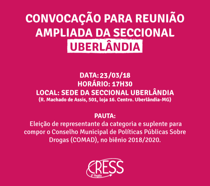 A diretoria da Seccional de Uberlândia do CRESS-MG convoca as e os assistentes sociais inscritas e inscritos em sua área de abrangência para Reunião Ampliada.