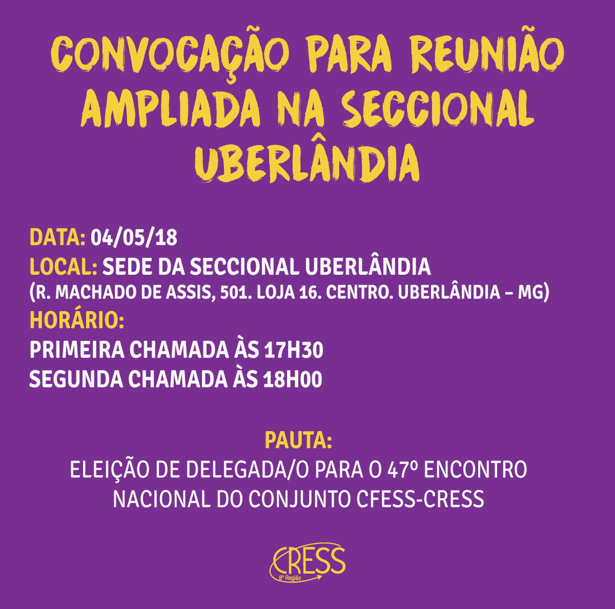 A diretoria da Seccional Uberlândia convoca as e os assistentes sociais inscritas/os em sua área de abrangência para Reunião Ampliada.