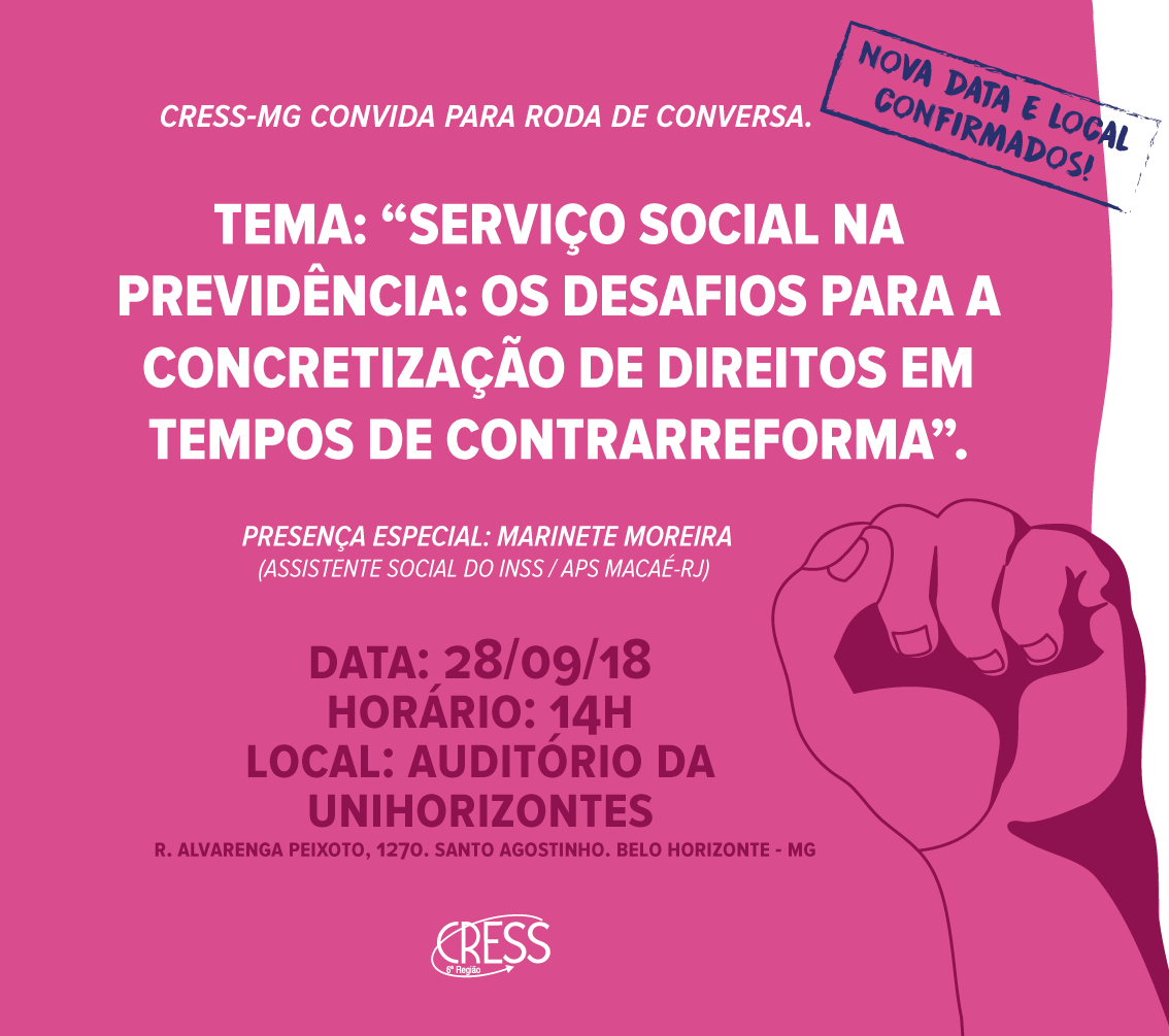 A roda de conversa "Serviço Social na Previdência: Os desafios para a concretização de direitos em tempos de contrarreforma" foi reagendada para o dia 28/09 e, devido ao grande interesse e adesão da categoria, o CRESS-MG promoverá a atividade no auditório da Unihorizontes – espaço maior, que possibilita a mais vagas de participação.