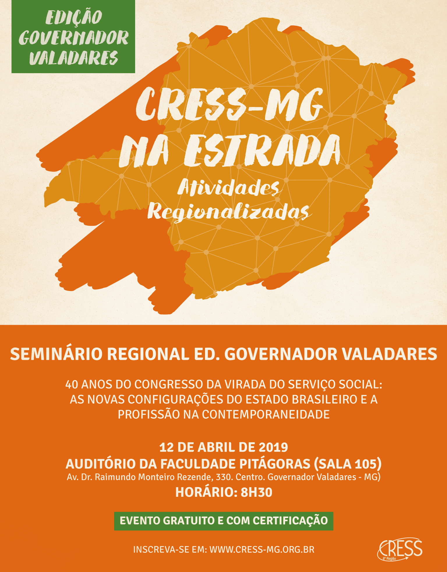 Já estão abertas as inscrições para o Seminário Regional – Edição Governador Valadares, que acontece no dia 12 de abril. O evento é gratuito e integra o Projeto CRESS-MG na Estrada – Atividades Regionalizadas, que tem como objetivo a interiorização das ações de formação permanente do Conselho, com vistas à valorização da profissão e contribuindo para o aperfeiçoamento técnico, teórico e político das e dos assistentes sociais.