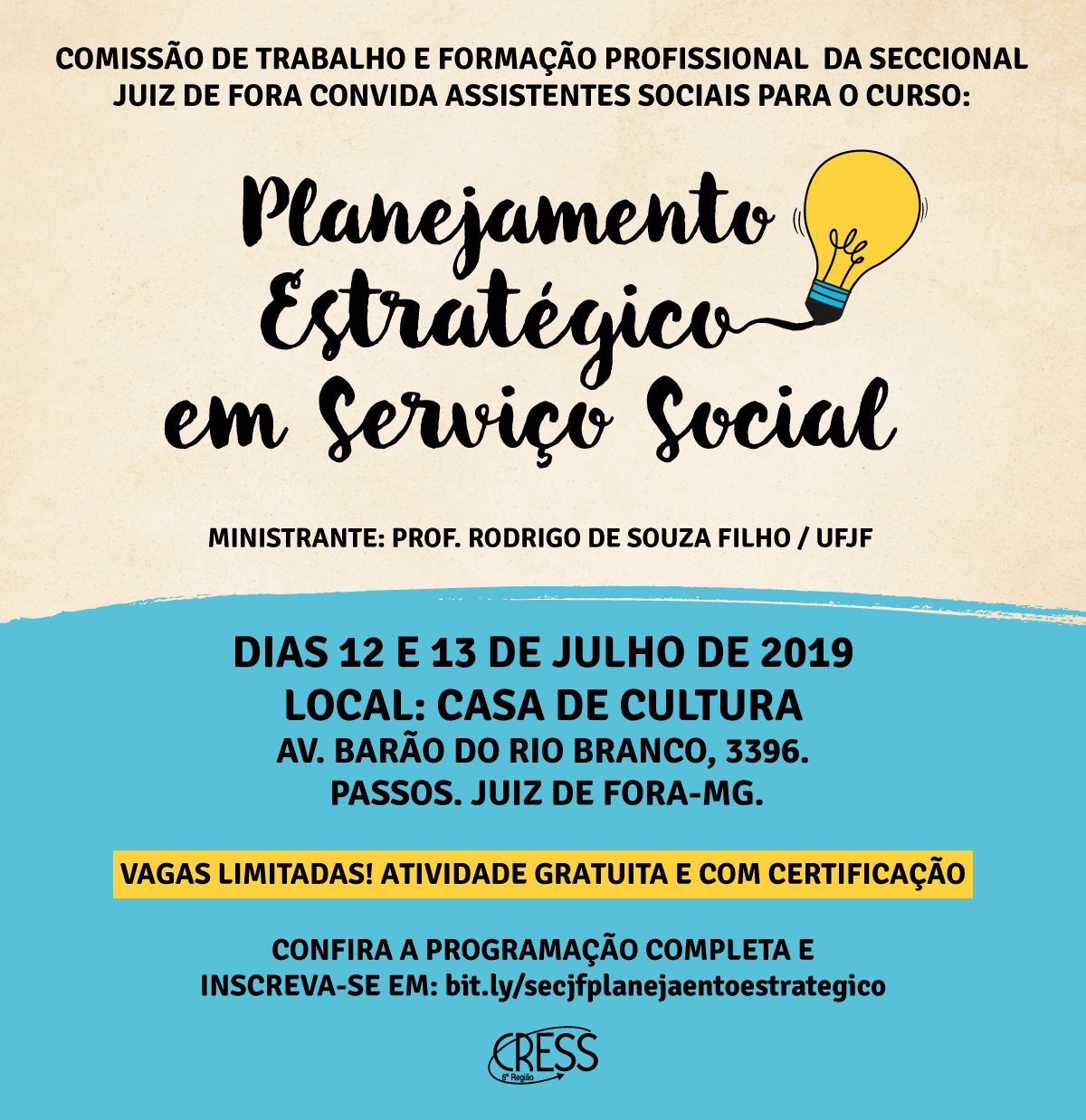 A Seccional Juiz de Fora, por meio da sua Comissão de Trabalho e Formação profissional, oferece, nos dias 12 e 13 de julho, o curso "Planejamento Estratégico em Serviço Social".