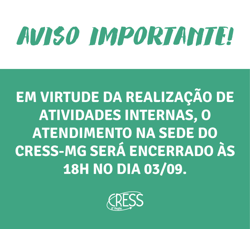 Em virtude da realização de atividades internas, Sede do CRESS-MG terá funcionamento alterado no dia 03/09