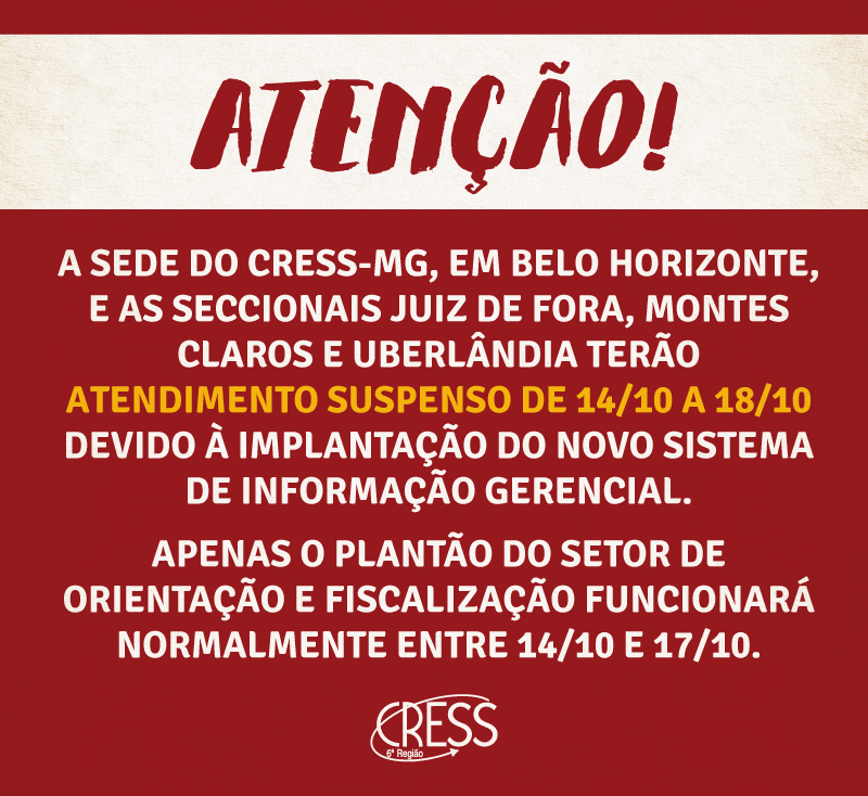 Atenção! CRESS-MG terá atendimento suspenso por uma semana (de 14 a 18 de outubro)
