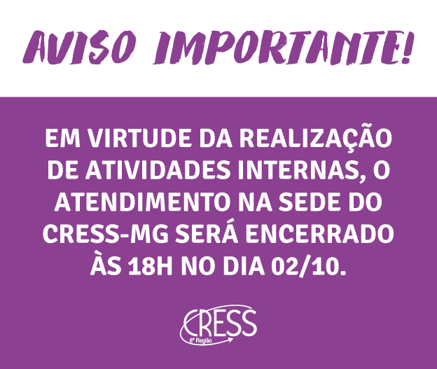 Em virtude da realização de atividades internas, Sede do CRESS-MG terá funcionamento alterado no dia 02/10