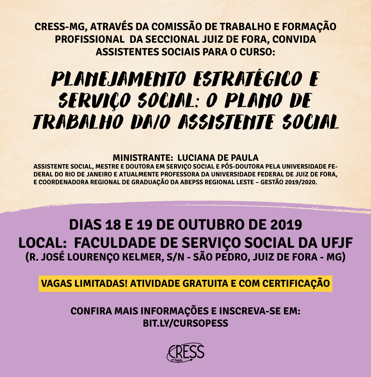 O CRESS-MG, por meio da Comissão de Trabalho e Formação Profissional da Seccional Juiz de Fora, oferece, nos dias 18 e 19 de outubro, o curso PLANEJAMENTO ESTRATÉGICO E SERVIÇO SOCIAL: O PLANO DE TRABALHO DA/O ASSISTENTE SOCIAL.