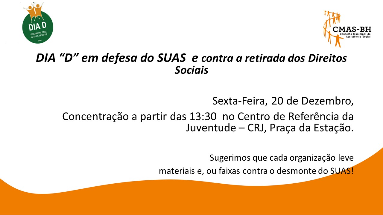 Nesse sentido, o Conselho Municipal de Assistência Social de Belo Horizonte (CMAS-BH), reafirmando seu compromisso com a Política Pública de Assistência Social e com um SUAS forte e empenhado na garantia dos direitos sociais, promove na sexta-feira, 20 de dezembro, um ato em defesa do SUAS, a partir das 13h, na Praça Sete, centro da capital mineira.
