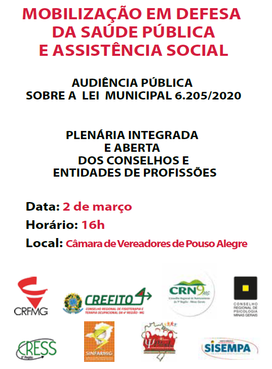 Entidades como sindicatos e conselhos de categoria profissional, entre eles o CRESS-MG construíram uma nota conjunta para esclarecer sobre o assunto e convidar a população para uma audiência pública, em Pouso Alegre, na segunda-feira, 2 de março, que visa mostrar os prejuízos que a lei trará as cidadãs e cidadãos do município.