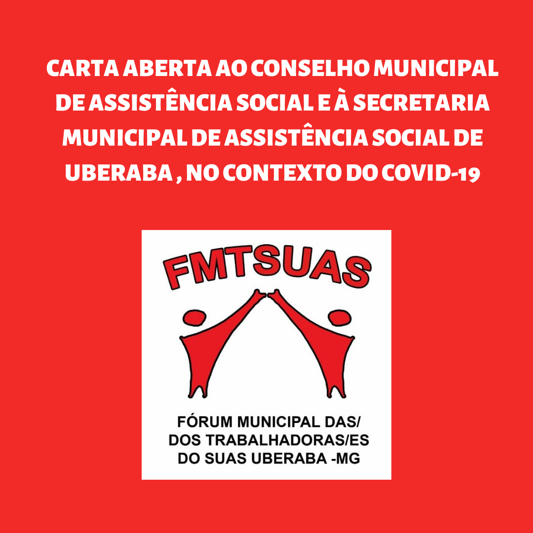 CARTA ABERTA DO FMTSUAS AO CONSELHO MUNICIPAL DE ASSISTÊNCIA SOCIAL E SECRETARIA MUNICIPAL DE ASSISTÊNCIA SOCIAL DE UBERABA