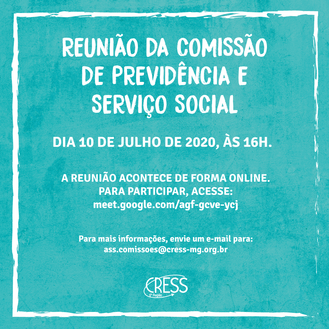 Para participar da reunião da Comissão de Previdência e Serviço Social do CRESS-MG, que acontece de forma virtual, acesse o link: https://meet.google.