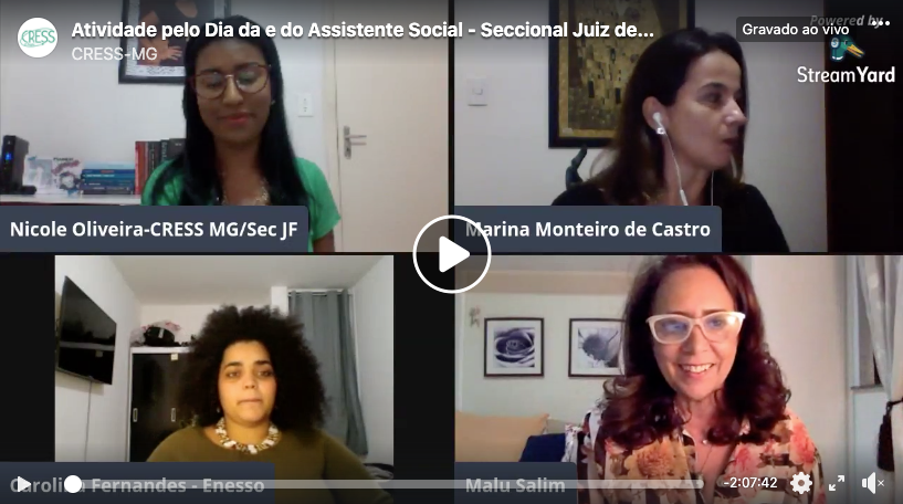 • 28/05: Participação da diretora Nicole Oliveira como palestrante da iniciativa “Toda semana uma live diferente”, na live do Instagram do Diretório Acadêmico Pe. Jaime Snoeck, da Faculdade de Serviço Social da Universidade Federal de Juiz de Fora (UFJF), com o tema “Desafios à formação e ao trabalho da e do assistente social em tempos de pandemia: MP do estágio, saúde mental e auxílio emergencial”.
