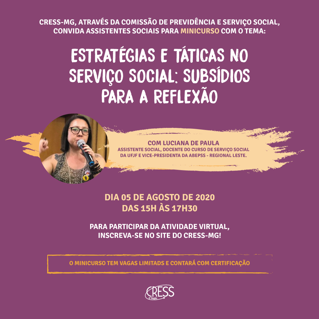 O CRESS-MG, por intermédio da Comissão de Previdência e Serviço Social, promove no dia 05 de agosto, das 15h às 17h30, o minicurso “Estratégias e táticas no Serviço Social: subsídios para a reflexão”.