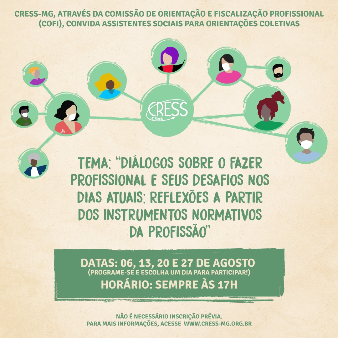 Pensando em ampliar a participação das e dos assistentes sociais nas rodas de conversa online do CRESS-MG, a Comissão de Orientação e Fiscalização Profissional (Cofi) promove, a partir da próxima quinta-feira, 06 de agosto, atividades semanais com o tema “Diálogos sobre o fazer profissional e seus desafios nos dias atuais: reflexões a partir dos instrumentos normativos da profissão".