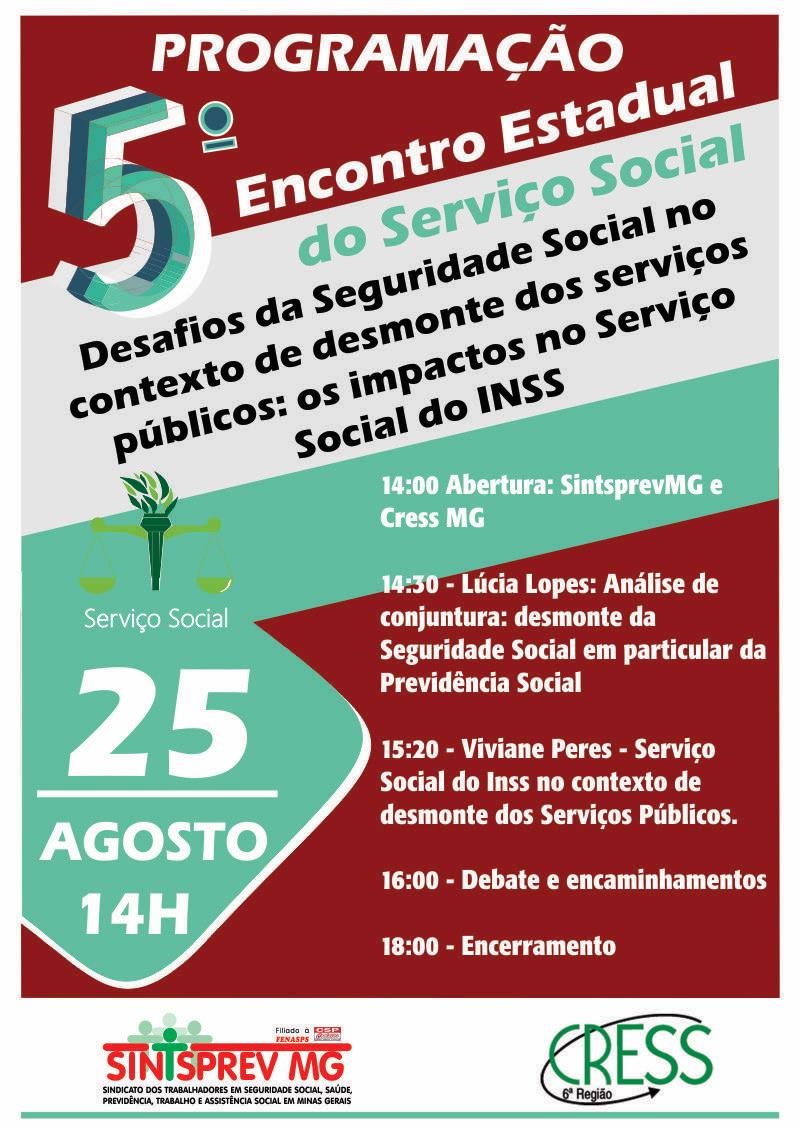 A atividade promovida pelo Sintsprev, com apoio do CRESS-MG, tem como tema “Desafios da Seguridade Social no contexto de desmonte dos serviços públicos: os impactos no Serviço Social do INSS”.