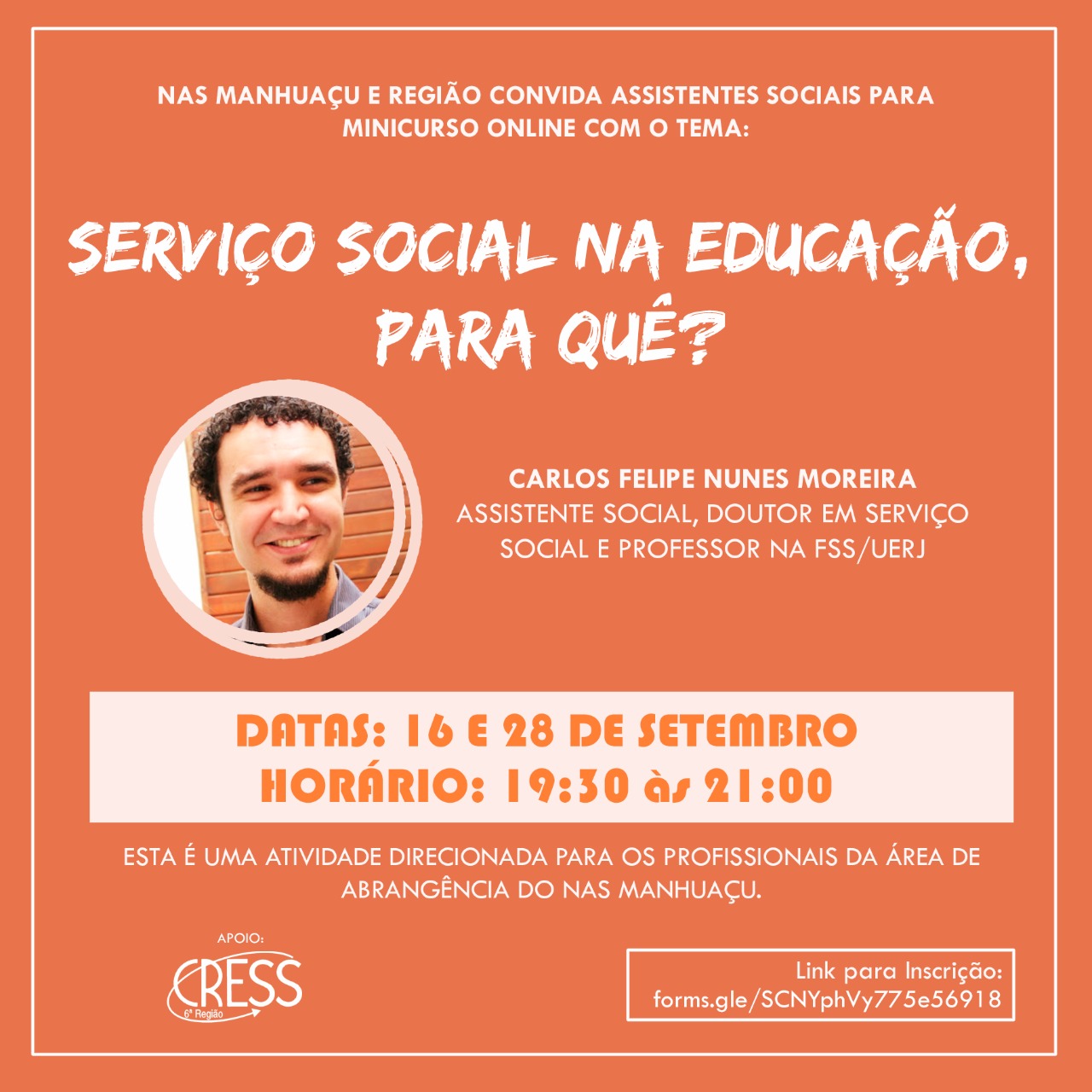 Em resposta aos acordos firmados com a categoria profissional da região, em reunião realizada no dia 2 de setembro, o Núcleo de Assistentes Sociais (NAS) de Manhuaçu oferta o minicurso com o tema “Serviço Social na Educação, para quê?”.